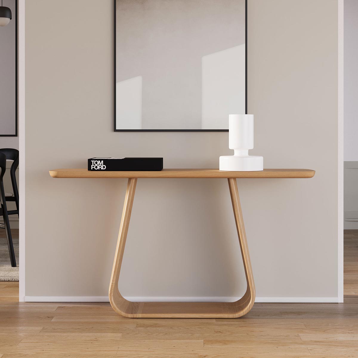 The Alba Console Table features a sleek rounded profile top and curved detail base. Available in 2 timber finishes. Coordinating dining and cabinetry available.